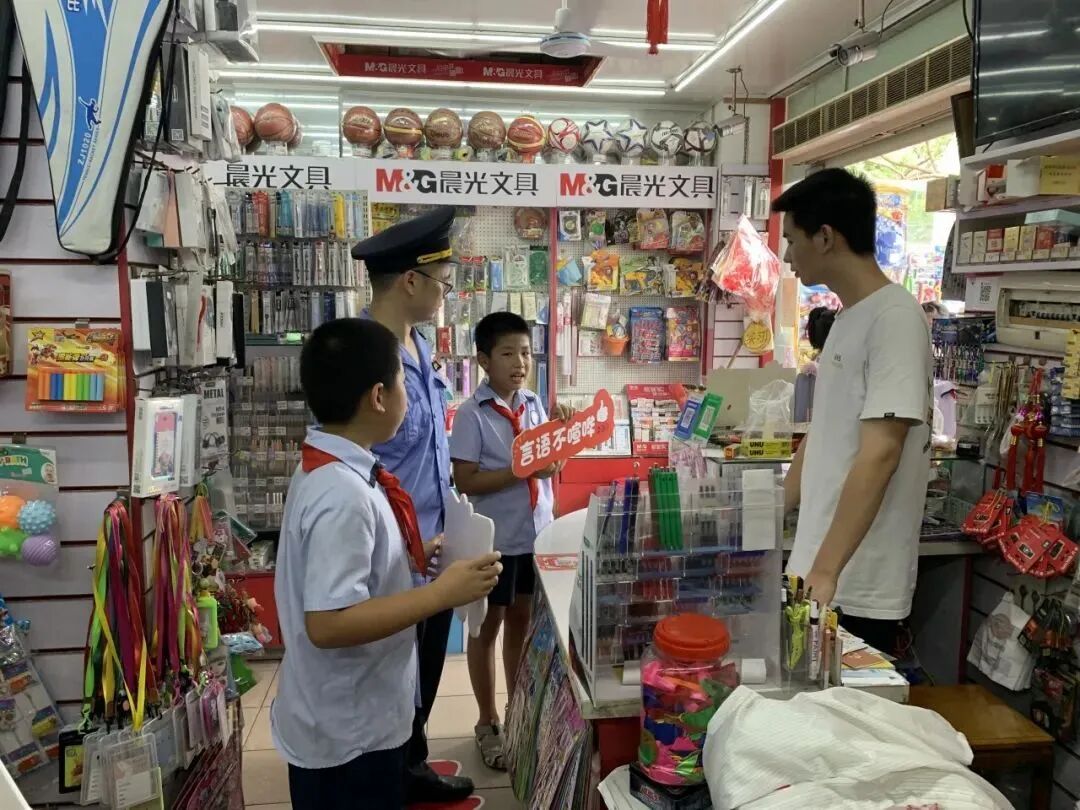 同学们来到商家内开展文明宣讲:“叔叔阿姨您好,我是小小志愿者,建设全国文明城区是为了能让我们生活的环境变得更加美好,希望您也能加入我们,一起参与垃圾分类,一起履行诚信经营,一起推广公筷公勺,让道路、店面都变得干干净净、漂漂亮亮的!”