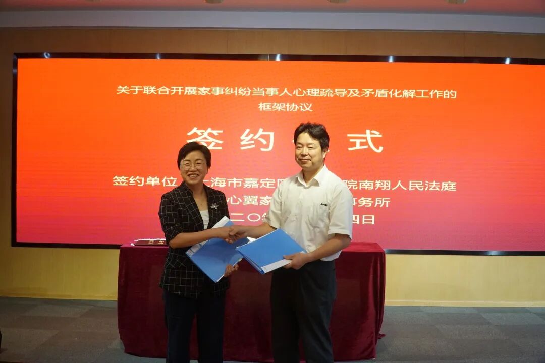 会后,上海心翼家庭社工师事务所与嘉定区人民法院南翔法庭签订了《关于联合开展家事纠纷当事人心理疏导及矛盾化解工作的框架协议》。