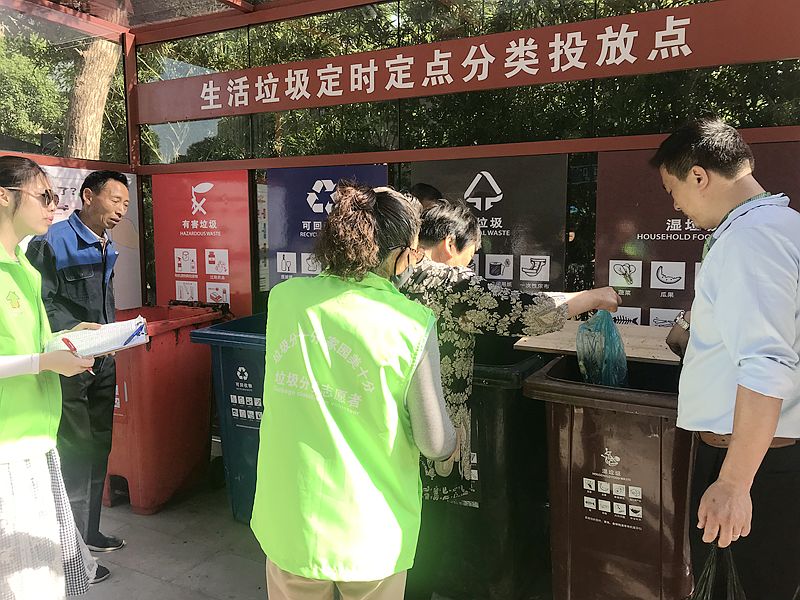社区垃圾分类志愿者穿着醒目荧光绿的垃圾分类衣服,拿着火钳“迎接”着一个个前来投放的居民。志愿者现场进行监督指导,针对分类错误的居民要求立即整改,现场进行分类后再投放,并对居民提出的疑惑以及如何分类进行耐心的解答。