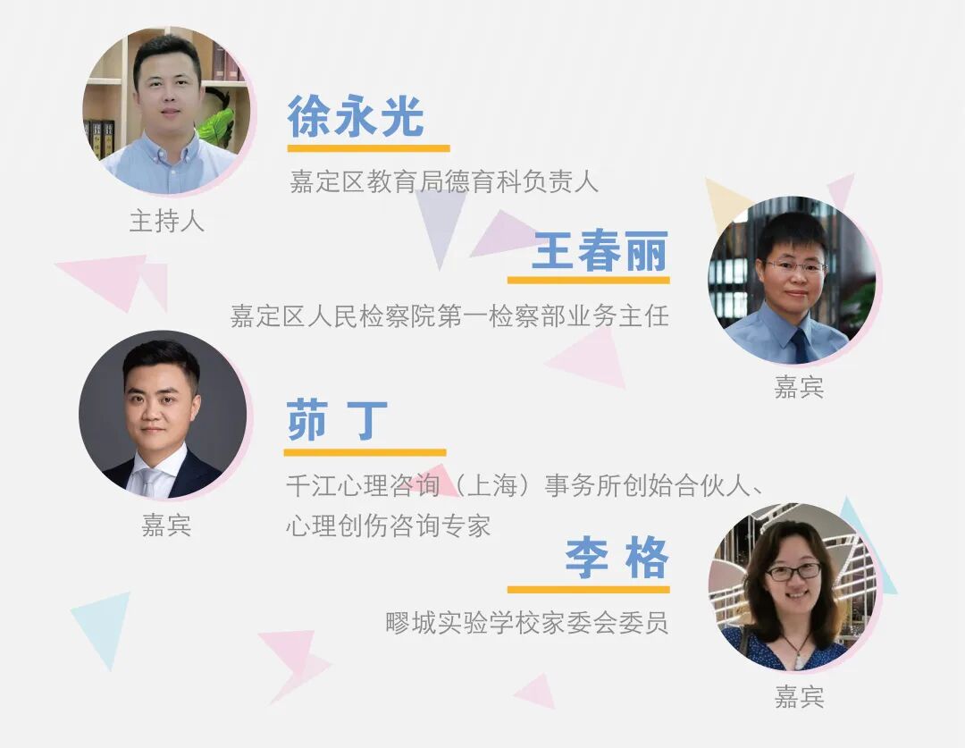 本次直播课由嘉定区教育局德育科负责人徐永光主持,上海市嘉定区人民检察院第一检察部业务主任王春丽、心理创伤咨询专家茆丁、疁城实验学校家委会委员李格为主讲嘉宾。