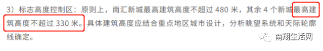 标志高度控制区:原则上,南汇新城最高建筑高度不超过480米,其余4个新城最高建筑高度不超过330米。具体建筑高度应结合重点地区城市设计,分析眺望系统和天际轮廓线确定。