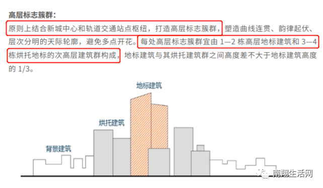 原则上结合新城中心和轨道交通站点枢纽,打造高层标志簇群,塑造曲线连贯、韵律起伏、层次分明的天际轮廓,避免多点开花。每处高层标志簇群宜由1-2栋高层地标建筑和3-4栋烘托地标的次高层建筑群构成,地标建筑与其烘托建筑群之间高度差不大于地标建筑高度的1/3。