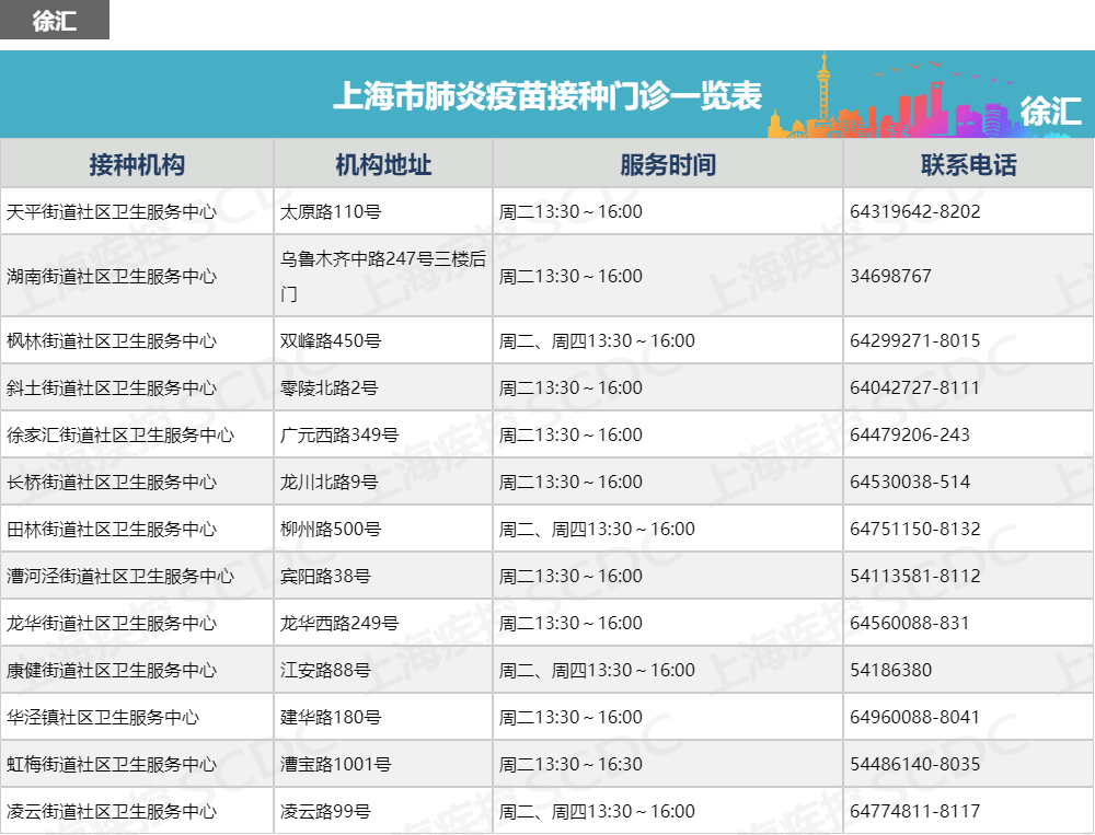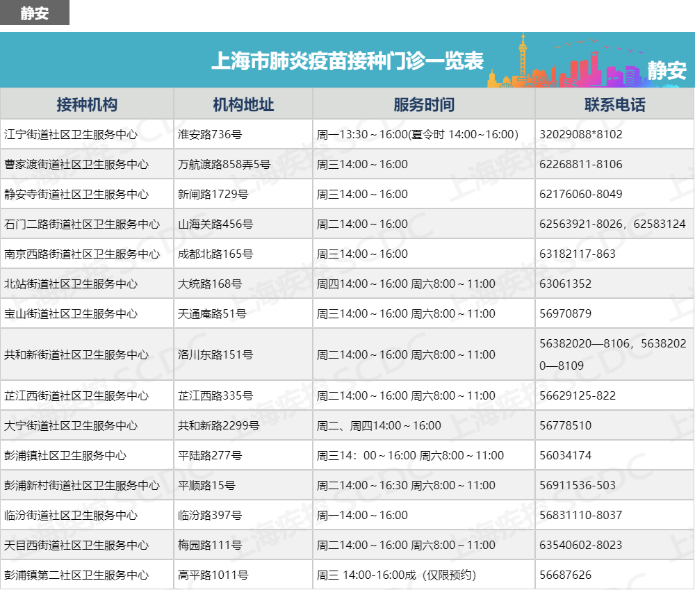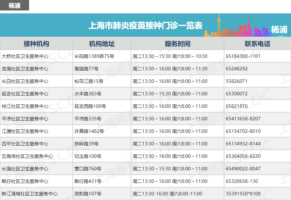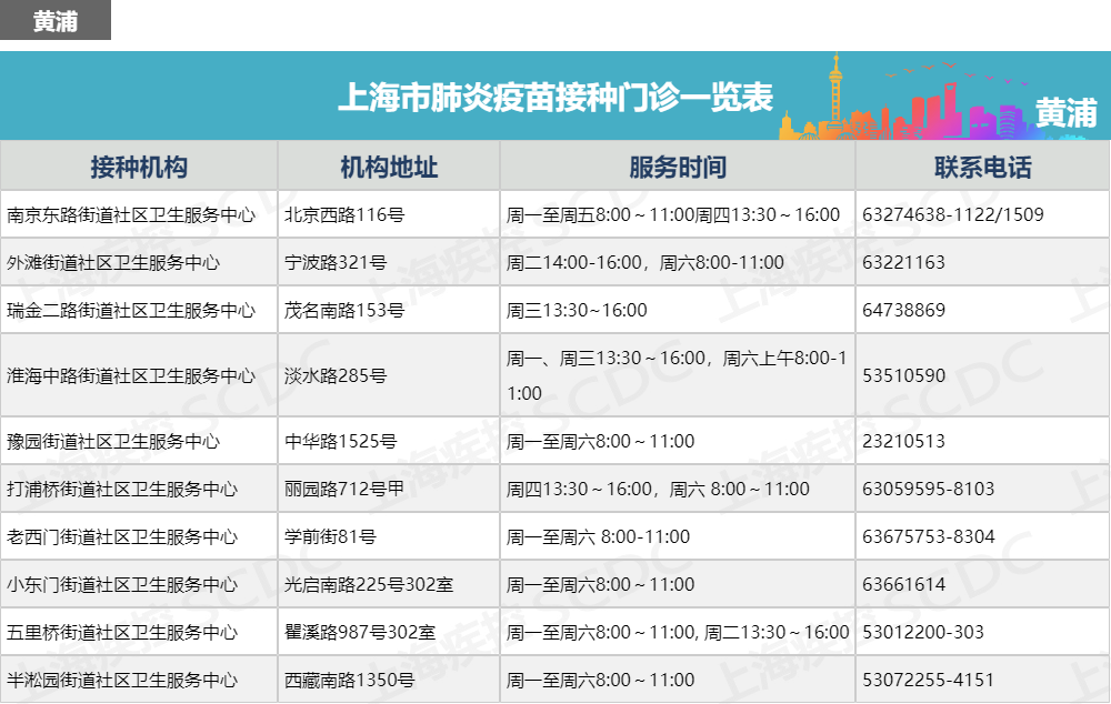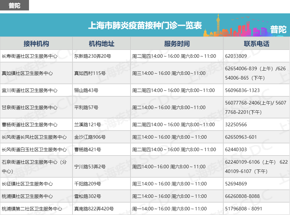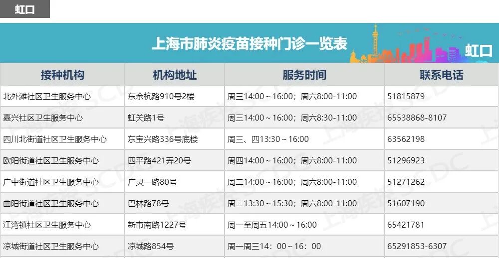 上海市肺炎疫苗接种门诊一览表