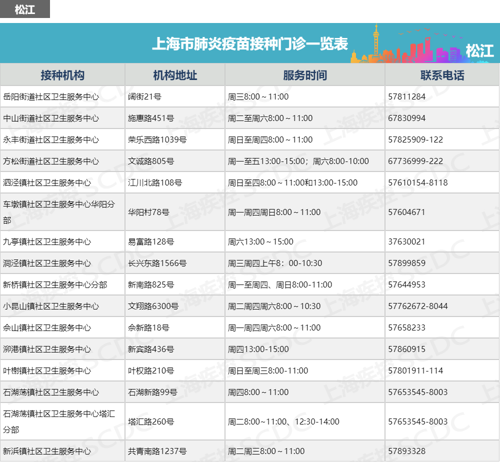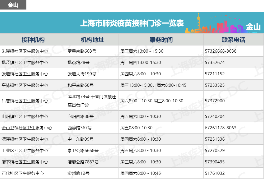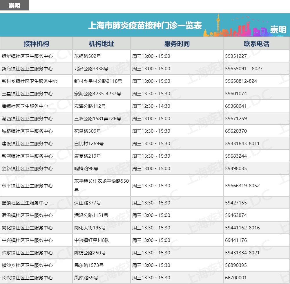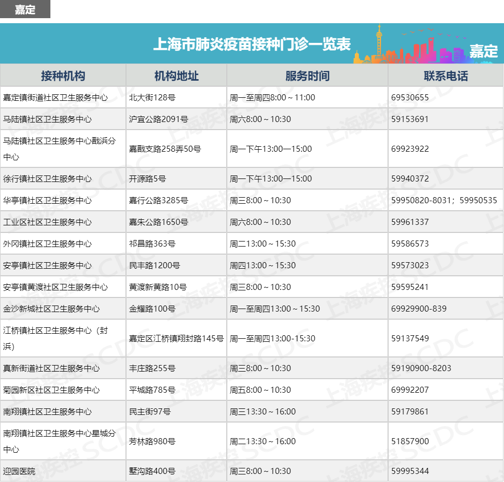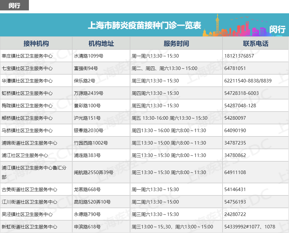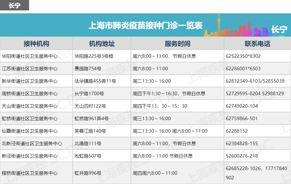 上海市肺炎疫苗接种门诊一览表