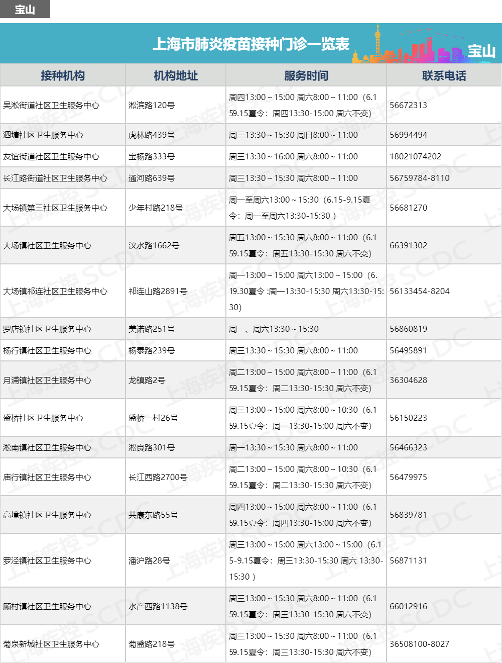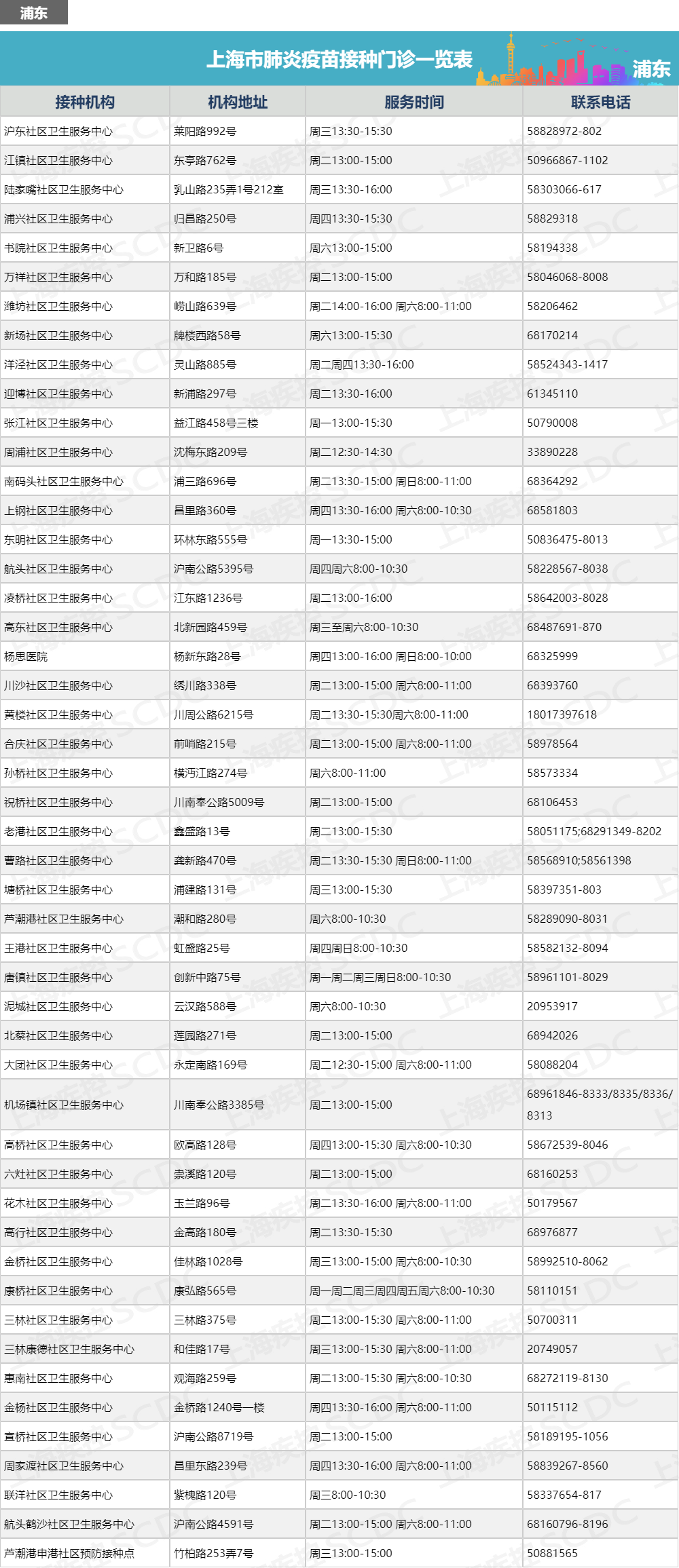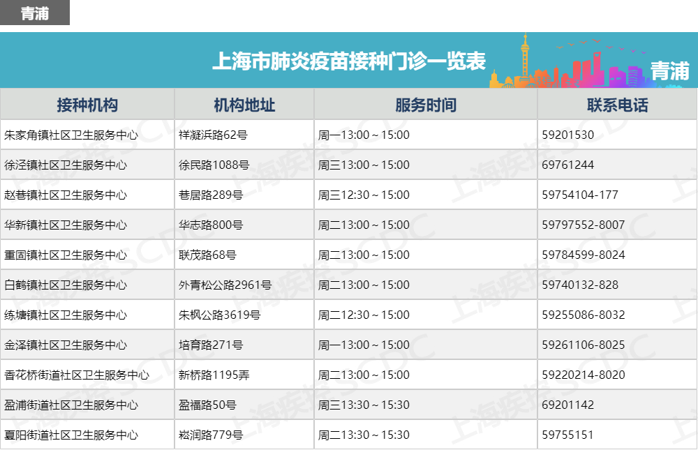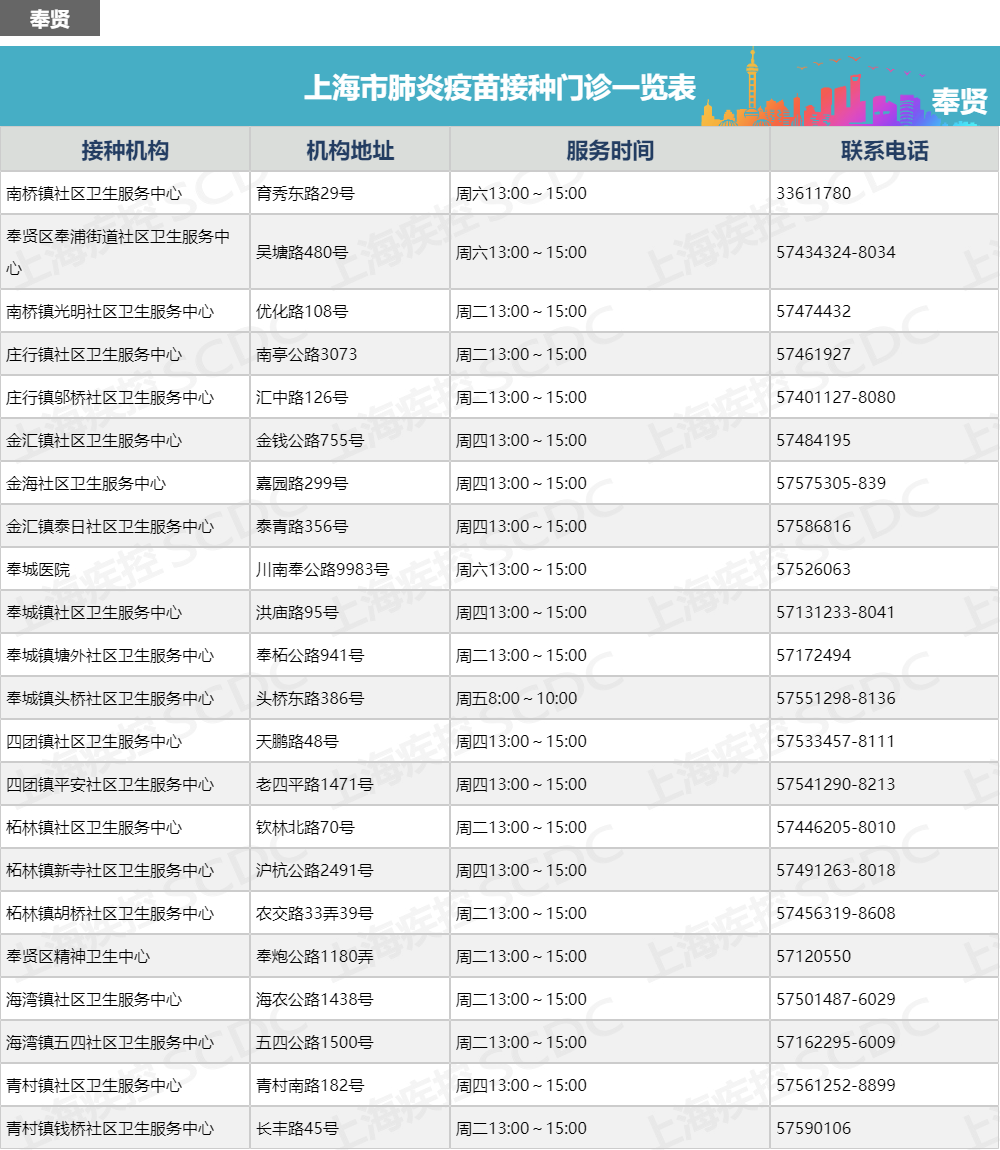 上海市肺炎疫苗接种门诊一览表