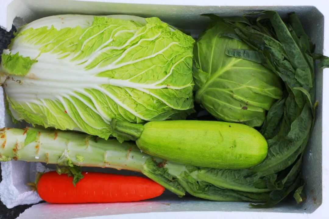 大娃娃菜、刀豆、青菜、菜苔、生菜、油麦菜、鸡毛菜、杭白菜、番茄、土豆、莴笋、大叶蓬蒿,(随机八个品种,具体品种根据生产实际随机配)+20个鸡蛋