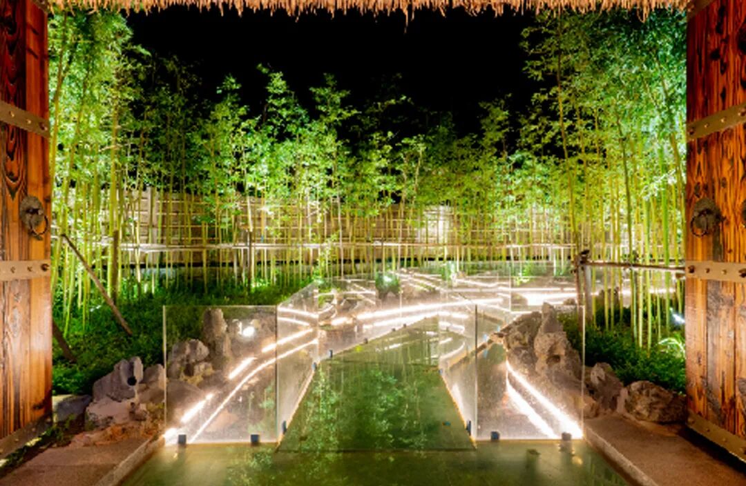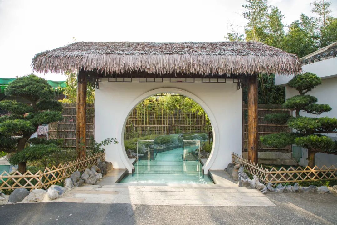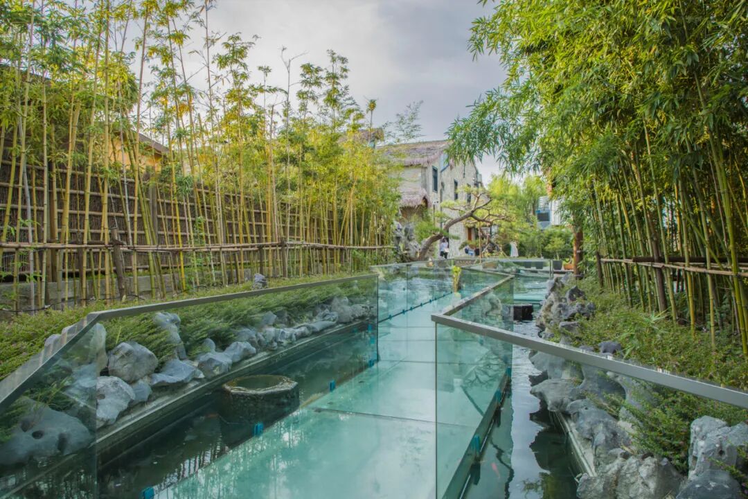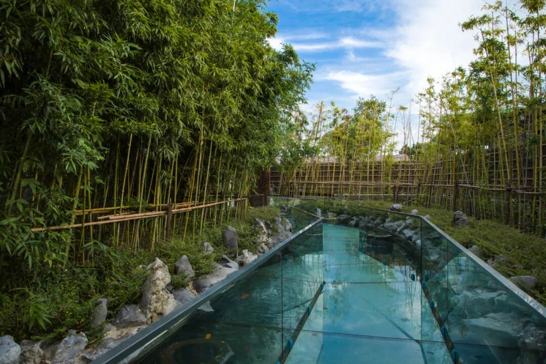 通往民宿的路上有一条网红玻璃栈道,沿着蜿蜒的玻璃栈道,呼吸着竹林的空气,看着脚下畅游的鱼儿,通往杏雨梨云,别有一番风味。