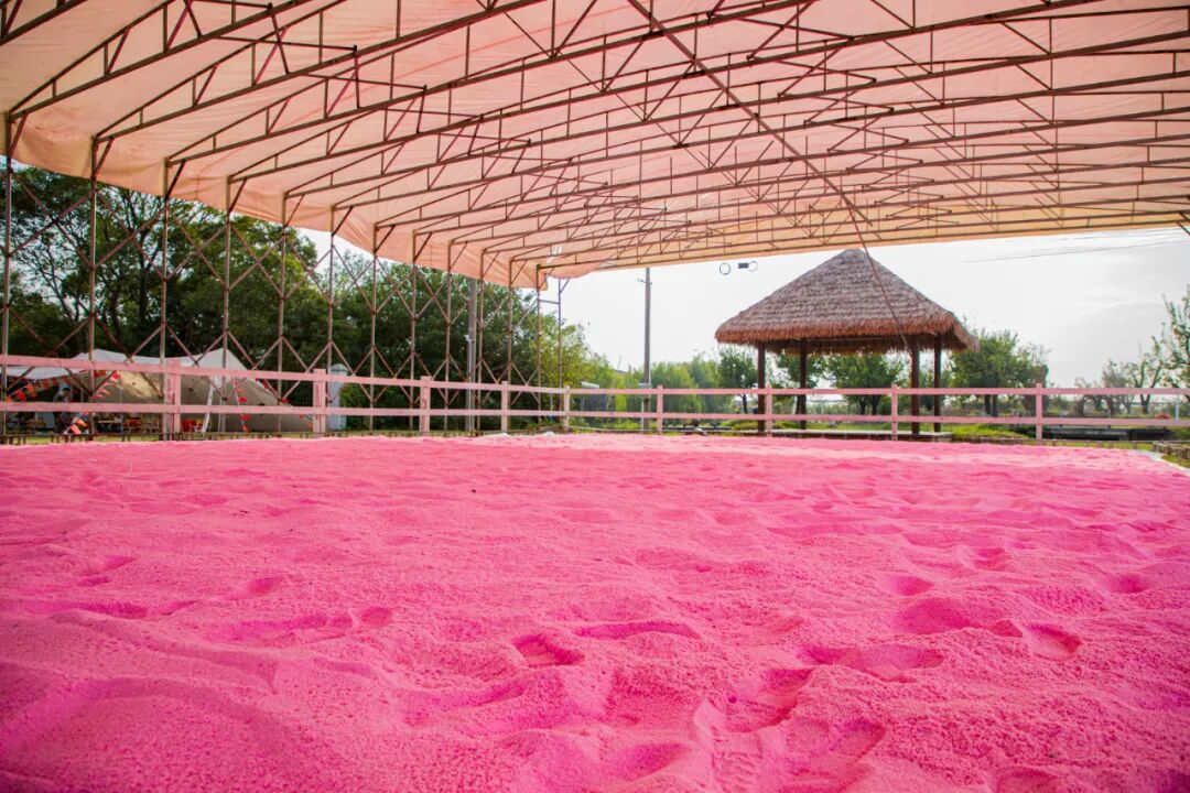 国庆期间愚农庄园新增了彩虹滑道和粉色沙滩,七彩的滑道从高处滑下,仿佛乘着七彩祥云。粉红色的沙滩充满着浪漫,细细软软的沙砾踩在脚下,捧起一把在指尖缓缓漏下。