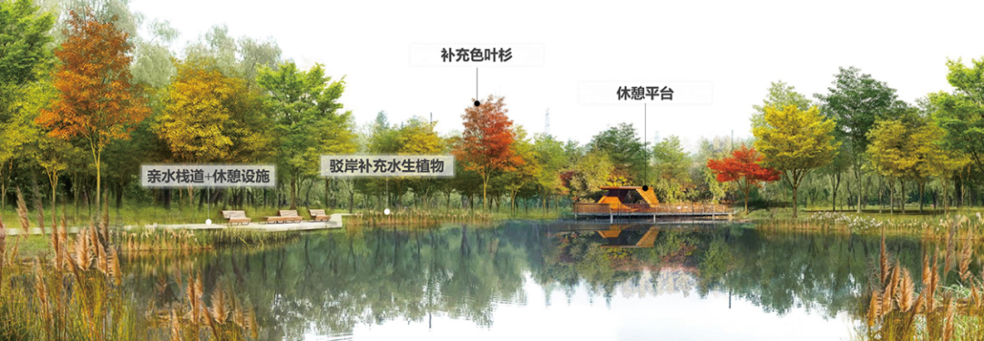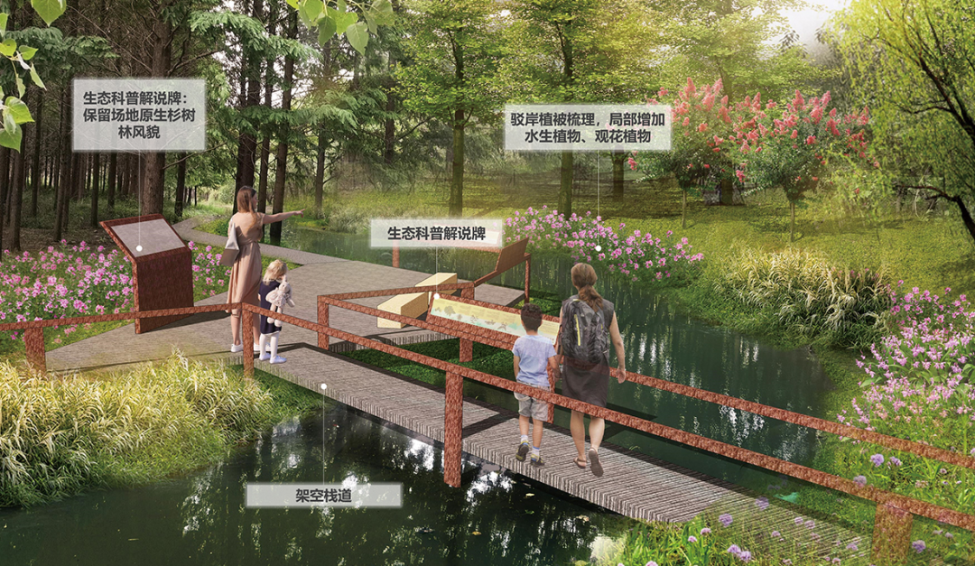 这里建于2003年,当初作为外环防护林而建,经过多年养护,拥有成片的水杉林、香樟林,杨家木桥浜等5条水系贯穿其中,营造出湿地、森林景观,成为白鹭、斑鸠等鸟类的栖息地。结合自然基地,绥德公园的设计主题为“繁华杉水涧、行隐嘉境里”,通过一系列“微更新”,实现从林地到公园的转身。