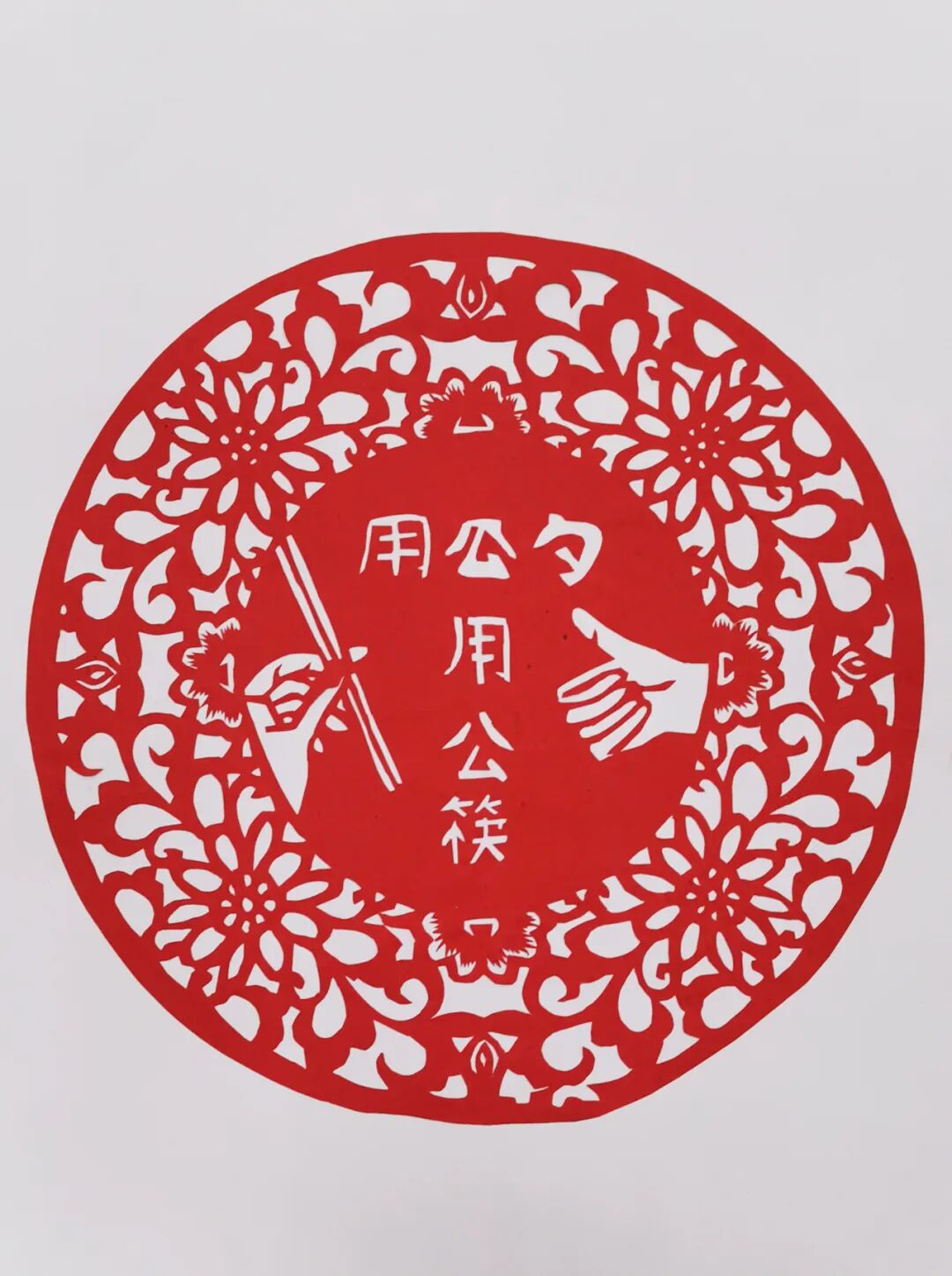 古猗园社区妇联书画社的成员们积极响应公勺公筷倡议,用巧手剪出的了“百万家庭新时尚 公筷公勺我家行”作品