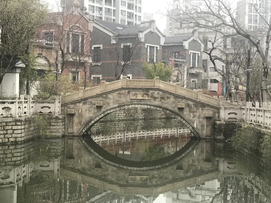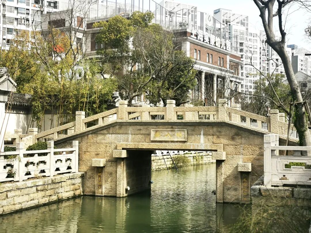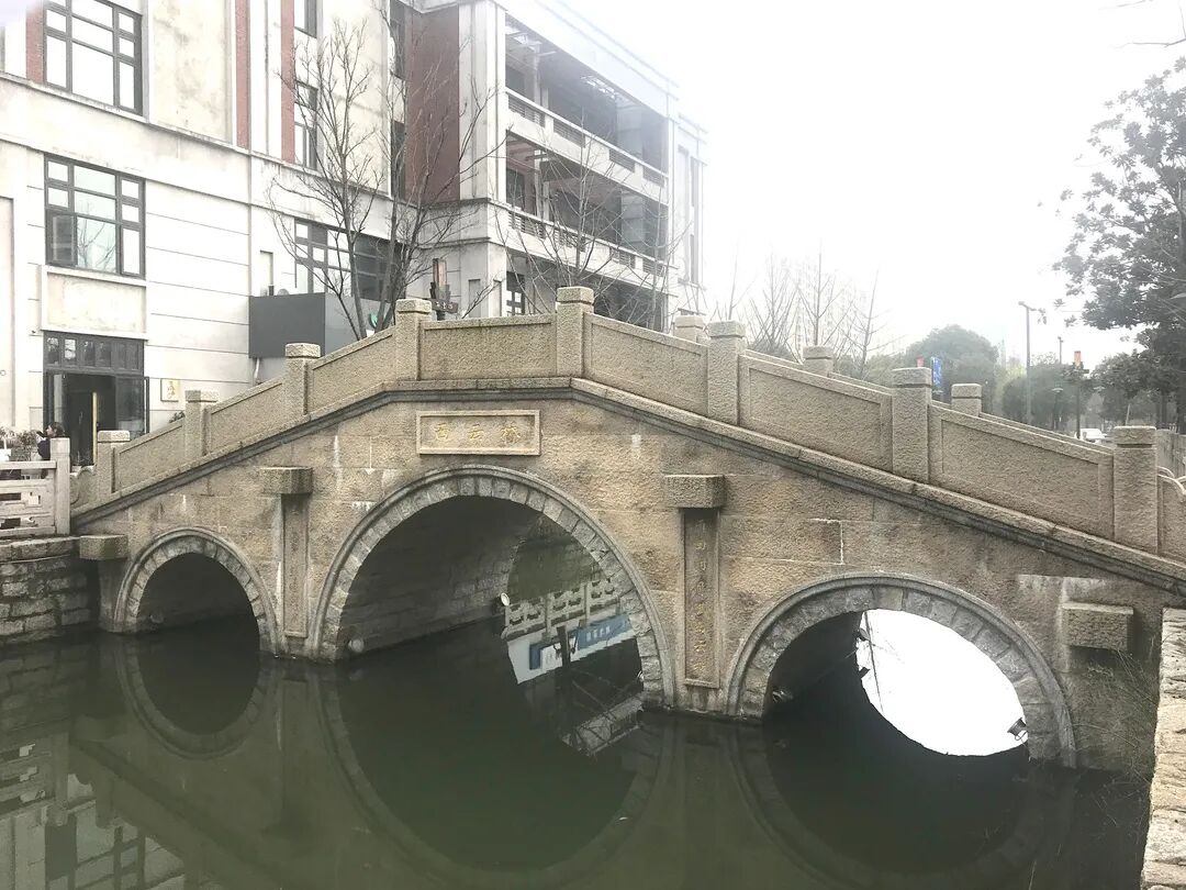 这是一座中国典型的三孔石桥,桥的两边是参照宋代女词人李清照著名词作《一剪梅》拟作的一幅对联:兰舟泛 日照疁河岸,燕归时 月满西云楼(疁读liu,嘉定别称)。