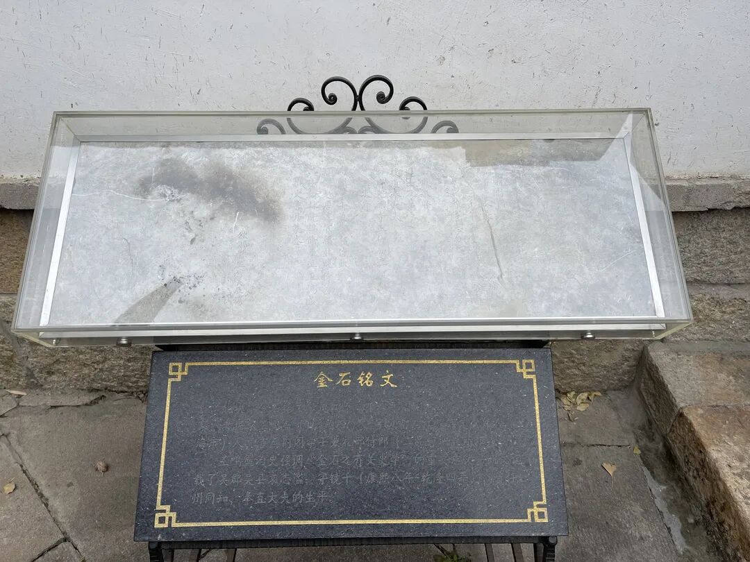 西云河北岸,金府门前,有一组六角亭,亭中央存放这一块用珍贵金石雕刻的石刻,此块“金石铭文”是乾隆二十四年间有清朝文学家、经济学家、考据家王鸣盛(1722-1797),江苏嘉定(今属上海市嘉定)人,官至内阁学士兼礼部侍郎(二品官职)所撰。