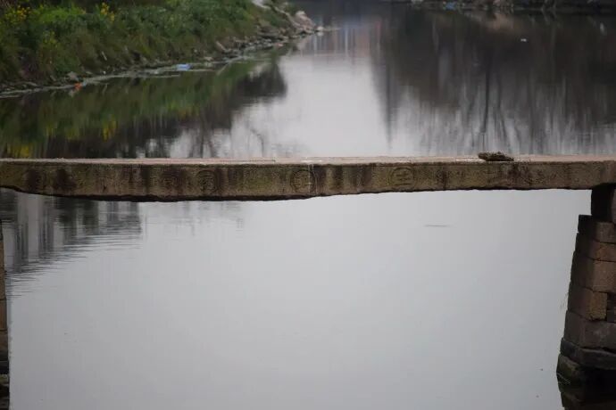 2010年5月1 9日,天刚透亮,赵春华就去寻找玉虹桥了。走到桥上后他发现,每跨有3条花岗石组成,有一跨中间一条石毁,其余均完好,但北端两跨坍掉,很有可能那些桥石沉在河底。当他走到中间一跨,低头细看,在凿出的3个圆形中,“玉虹桥”3个字清晰可见。