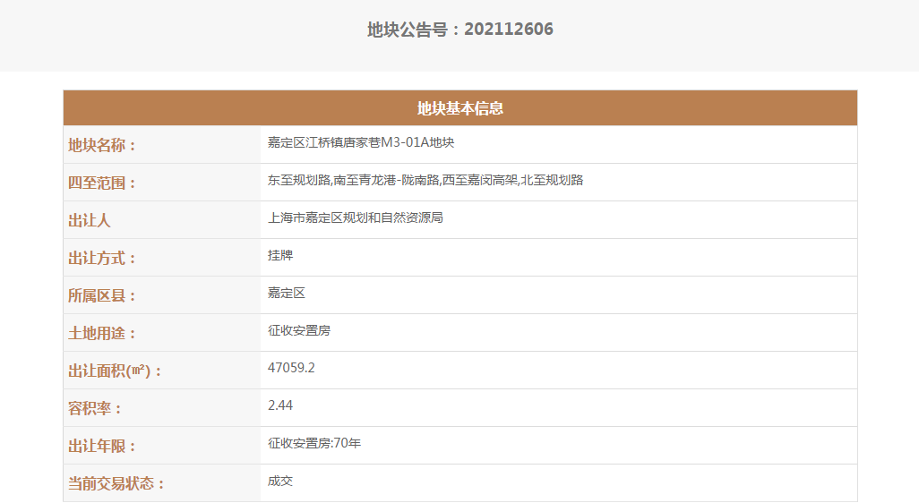 昨天(11月29日),嘉定区江桥镇唐家巷M3-01A地块成功出让,上海合创永昌建设管理有限公司竞得该地块,未来将建不少于1444套安置房,用以安置江桥镇北虹桥开发区域相关农户。