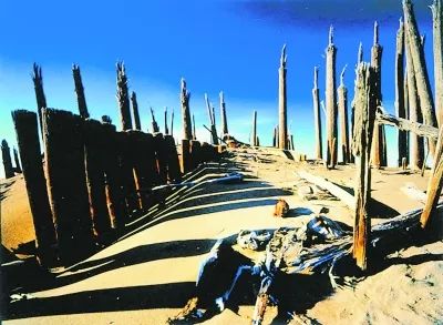 ▲2000年的小河墓地,到处是散落的船棺和干尸。