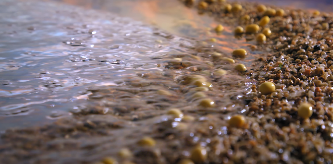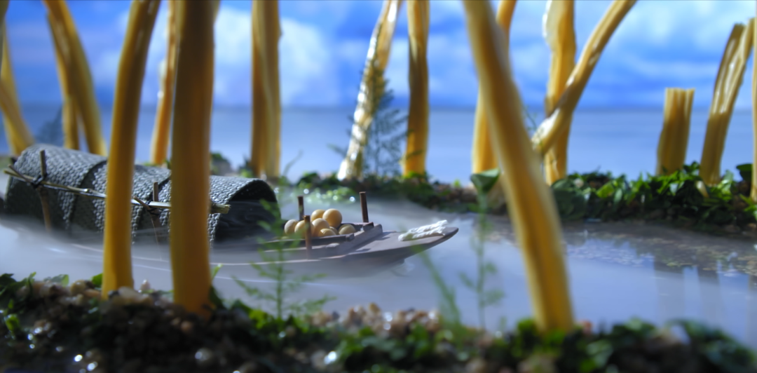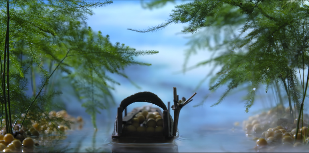 细细看来,这些秀丽的风光却并不是真的山水。乌篷船里,没有船工,装的是颗颗黄豆,而河边的“鹅卵石”亦是由黄豆“冒充”。