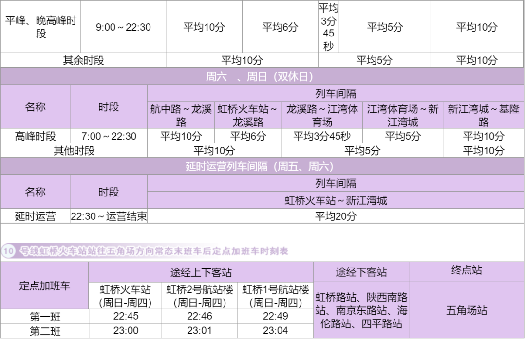 1. 10号线虹桥火车站站至新江湾城站区段每周五、周六延长运营时间。