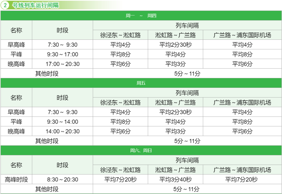 1. 2号线每周五、周六延长运营时间,不含2号线东延伸段(广兰路站~浦东国际机场站)。
