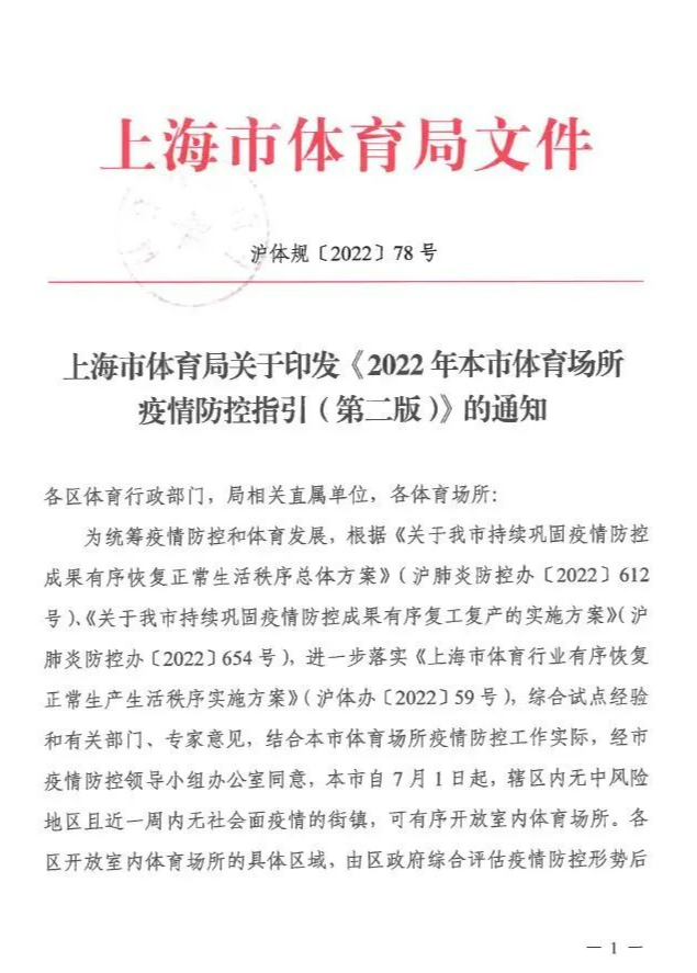 6月29日,上海市体育局印发《2022年本市体育场所疫情防控指引(第二版)》的通知,明确自7月1日起,辖区内无中风险地区且近一周内无社会面疫情的上海街镇,可有序开放室内体育场所。