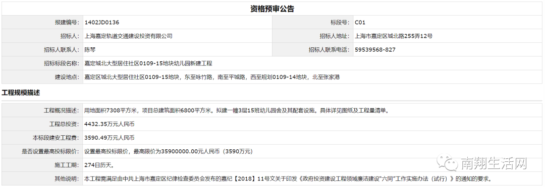 关于该幼儿园此前的施工资格预审公告信息南翔生活网也给大家分享过。