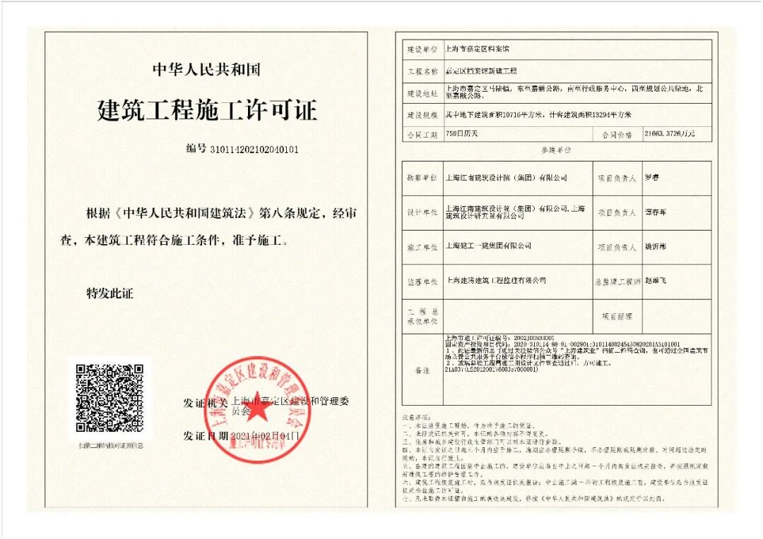 2021年2月5日,由嘉定城发集团代建的嘉定区档案馆新建工程取得施工许可证,工程总工期为750天,预计于2023年3月建设完成。