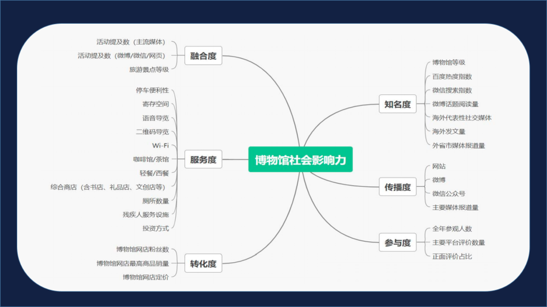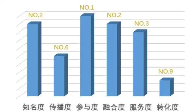 评估体系共由二级指标构成,其中一级指标为知名度、传播度、参与度、融合度、服务度、转化度,六大指标下共设31个二级指标。