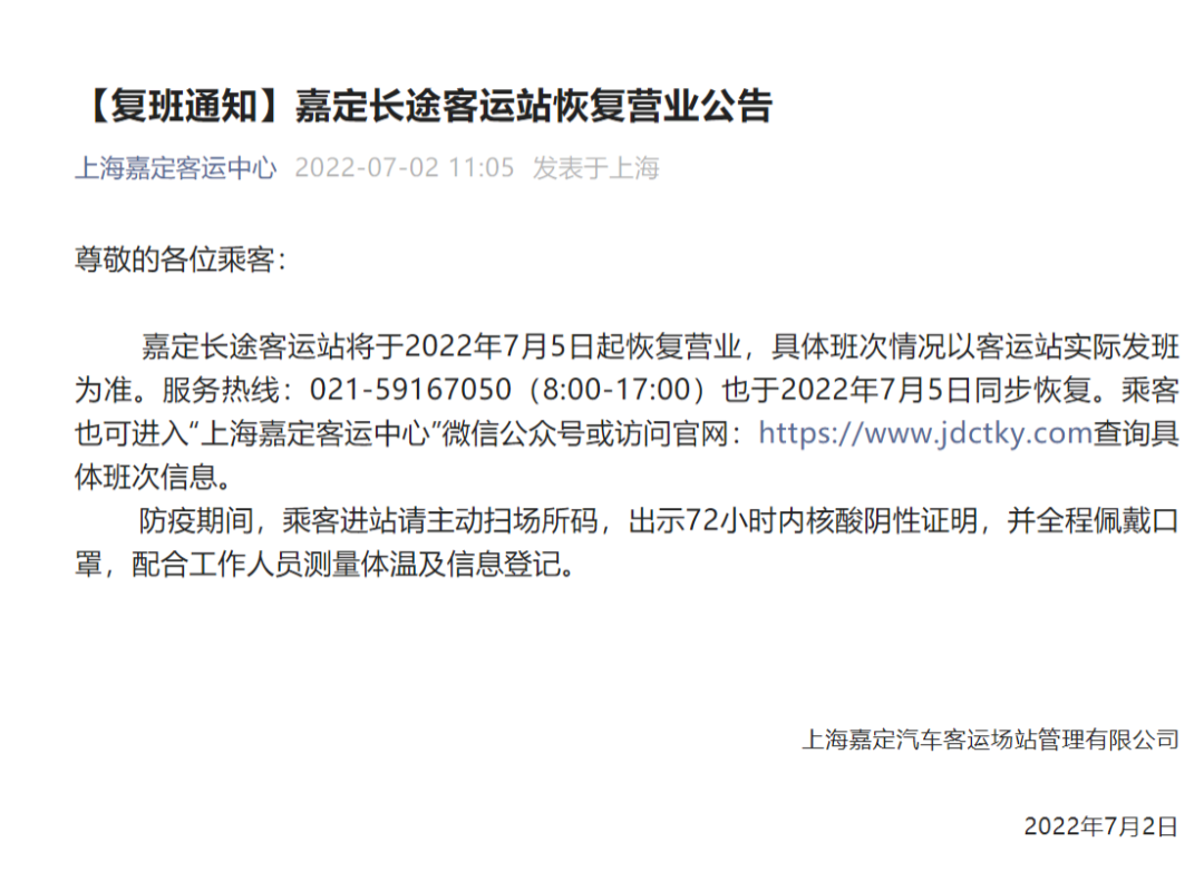 据嘉定客运中心今日发布:嘉定长途客运站将于2022年7月5日起恢复营业,具体班次情况以客运站实际发班为准。具体内容如下: