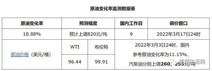 3月16日消息,国际油价在15日再次迎来大幅下跌,回落至每桶100美元以下。截至当天收盘,WTI原油4月期货价格收于96.44美元/桶,跌幅为6.38%;布伦特原油5月期货价格收于99.91美元/桶,跌幅为6.54%。   受此影响,3月17日(周四)24时国内油价调整上涨幅度也将迎来“缩水”。     截止3月15日国内10个计价工作日第9日,当前原油变化率为18.88%,预计上调820元/吨,相比上周最高1040元/吨的上调幅度有所减少。折合为升,当前预计上调0.63-0.7元/升。以家用车60L油箱计算,加满一箱油约多花费37.8元-42元。   本轮油价上调后,国内成品油零售价格将迎来2022年以来的第5次上调,算上2021年年末的一轮上涨调整,国内油价近期将迎来“六连涨”。     以北京地区油价为例,预计92号汽油市场价格将从当前的8.05元/升上涨至超过8.6元/升,95号汽油将从当前的8.56/升上涨至超过9.1元/升。   全国油价最高的地区仍然在海南省,本轮油价调整后,当地95号汽油价格预计将突破10元/升。     注:本轮油价调整将于3月17日24时正式生效,车主可于3月17日当天加油,享受调整前的油价。
