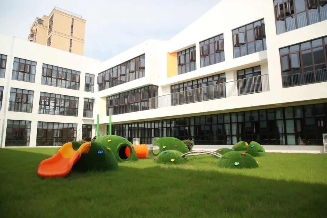 在幼儿园的中央大草坪上,不仅有户外大型玩具和健身器材,还设置了酷似“霍比特小屋”的游玩场所,有小型天桥和滑滑梯供孩子游乐。