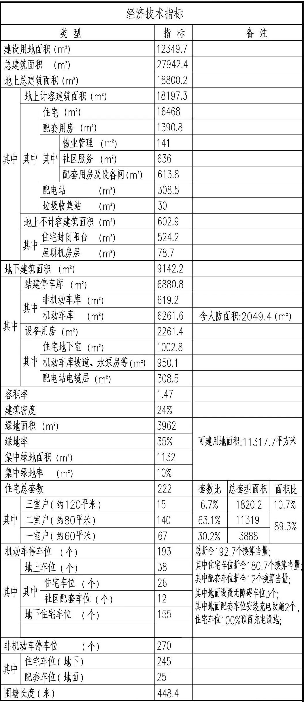 总建筑面积27942.2平方米,地上计容建筑面积18197.3平方米。(其中地下建筑面积9142.2平方米)。共222套住宅,含一室户、二室户、三室户三种户型,面积为60-120㎡。机动车位共193个。