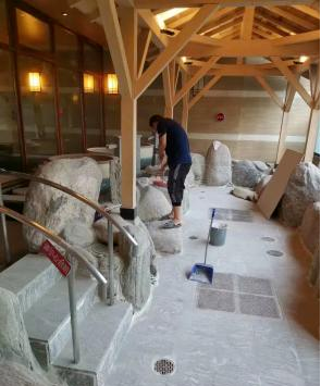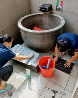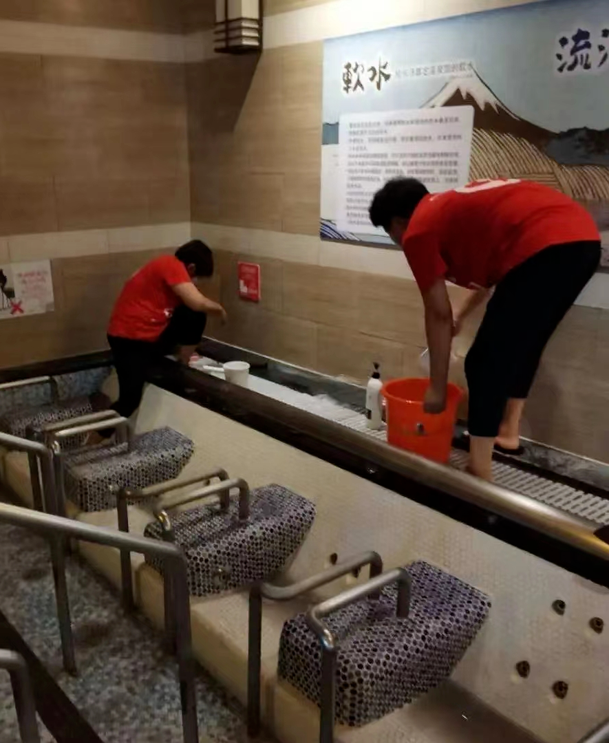 ①汤池消毒清洗;泡汤最重要的一定是汤池的卫生与消毒,工作人员对嘉定店温泉外围以及温泉泡池内的边边角角全部严格清洁消毒,保障客人泡汤无忧。
