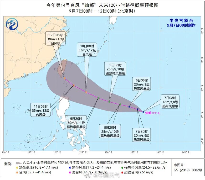 据中央气象台消息,今天上午8时,今年第14号台风 “灿都”(CHANTHU )在距离菲律宾马尼拉偏东方向约1690公里海面上生成, 强度等级为热带风暴级,中心附近最大风力8级(18米/秒) ,中心气压最低1000 hPa 。预计 “灿都”将以每小时10公里左右的速度向西偏北方向移动,强度逐渐加强。
