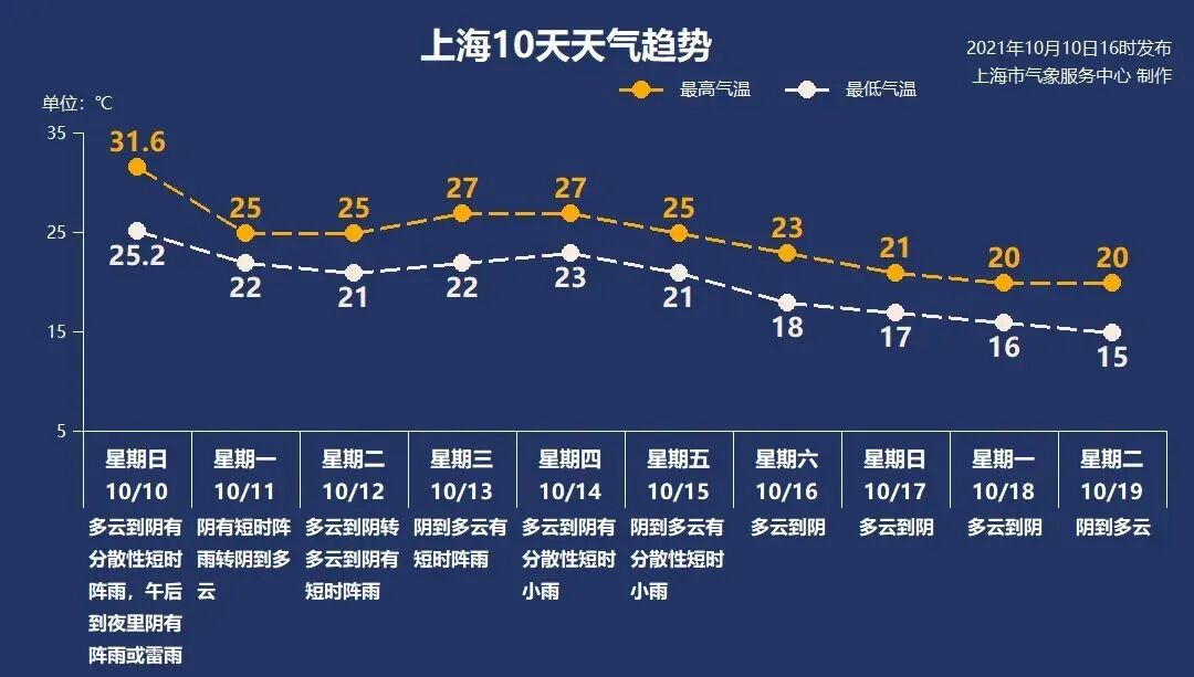 15日以前,上海处在副热带高压边缘,多阵雨出没,气温稳定在21℃~27℃之间,16~19日随着一波强冷空气南下,全国大部将出现降温和大风天气,上海最低气温跌进20℃,届时也将迎来一段秋高气爽的天气。