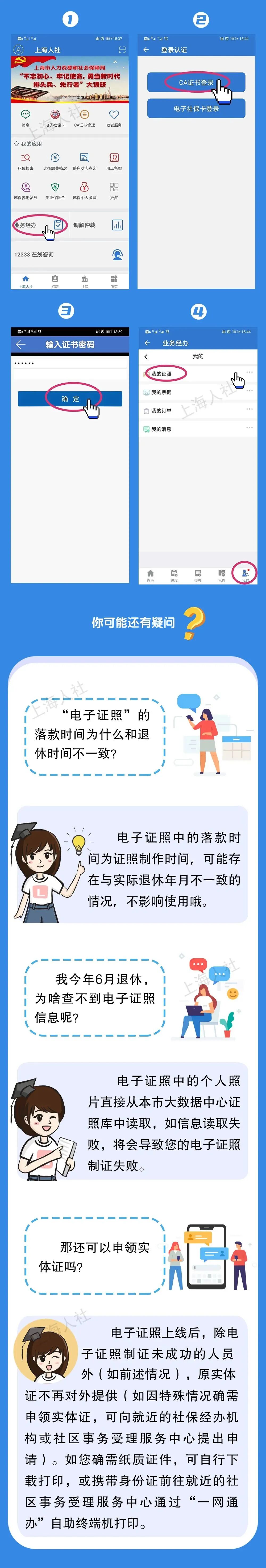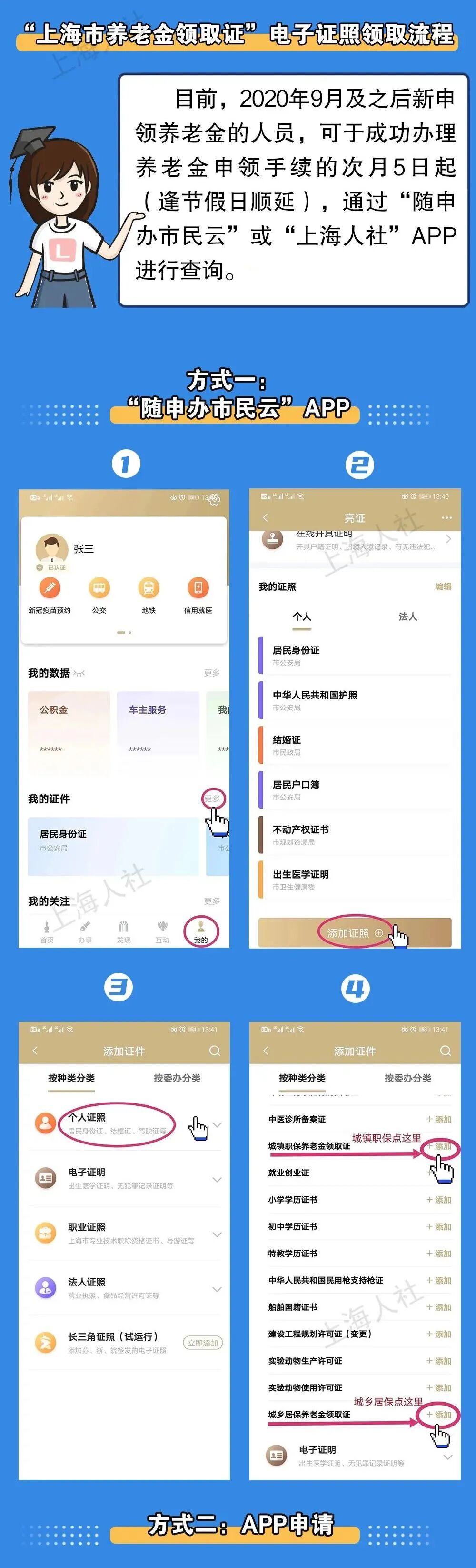 市人社局说,2020年9月及之后成功办理养老金申领手续的人员,均可通过手机移动端领取“上海市养老金领取证”电子证照,随时随地手机“亮证“。详见↓