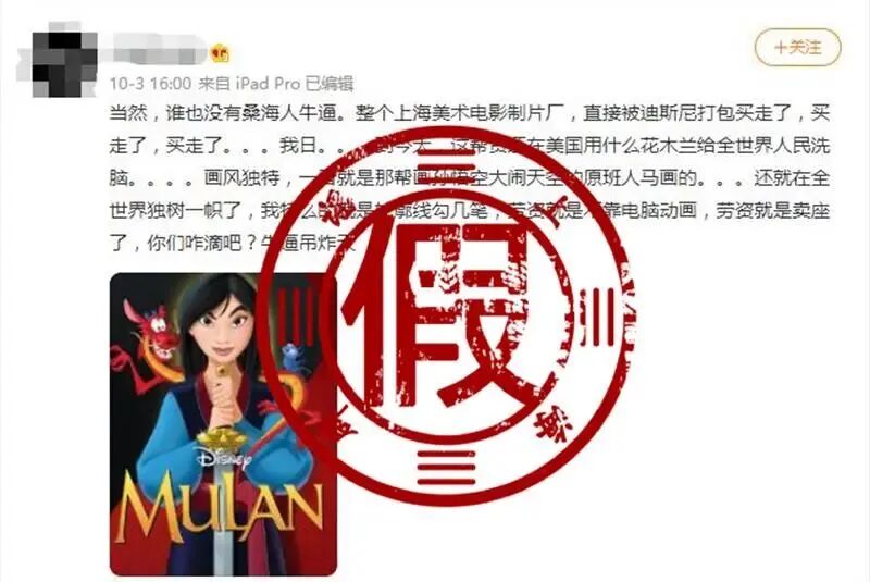 近日有网友发帖称:“整个上海美术电影制片厂,直接被迪士尼打包买走了”,给出的理由是“迪士尼的作品《花木兰》是由《大闹天宫》原班人马制作而成”。