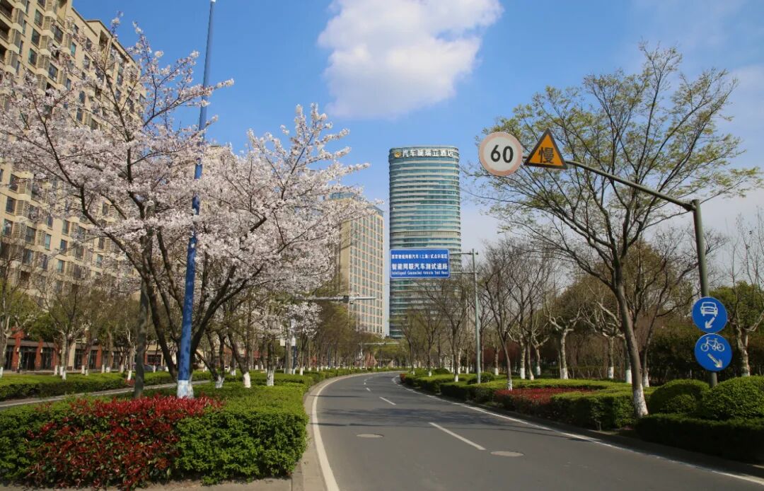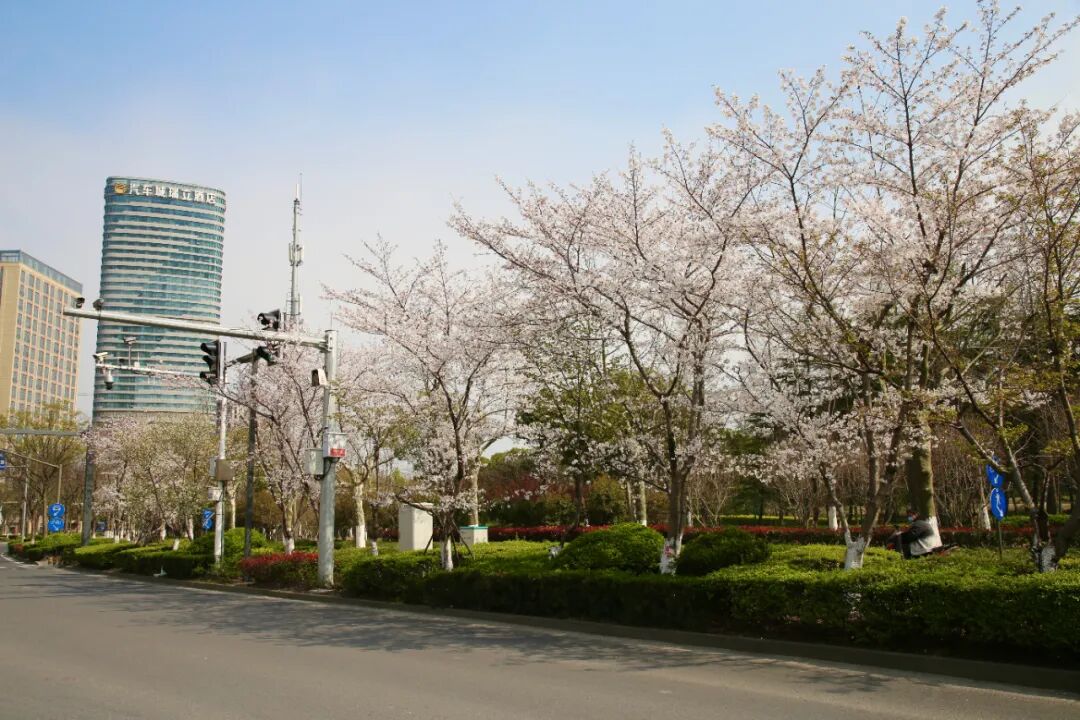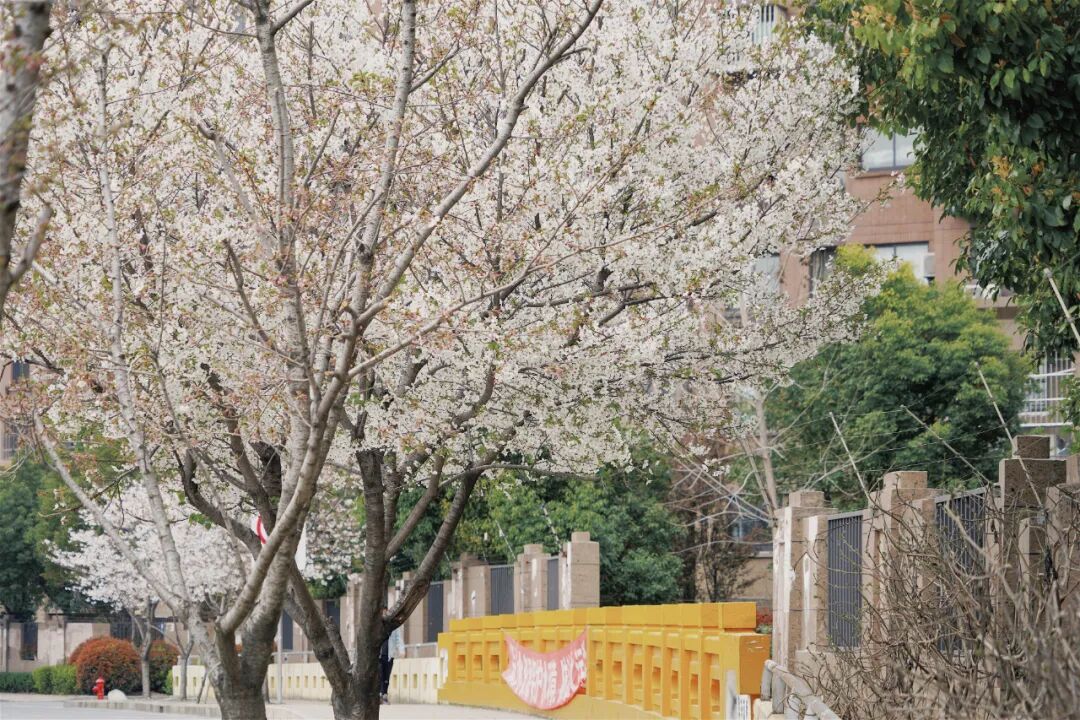江桥镇海波路、嘉峪关路两侧的吉野樱进入盛花期,行走在路边,宛若置身于一片灿烂花海,让人心旷神怡。