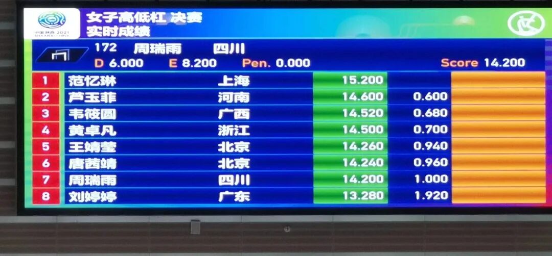 范忆琳又一次摘得全运会高低杠金牌