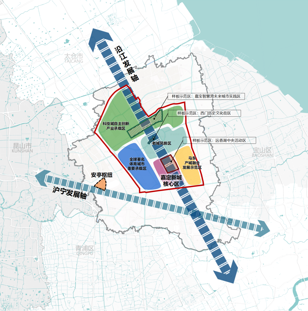 功能布局和空间格局上,立足打通长三角一体化和虹桥国际开放枢纽的链接通道,进一步优化嘉定新城空间结构和功能布局,实施“北拓西联”扩区计划: