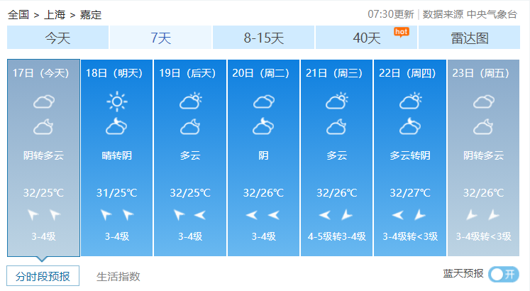 - 2021年的第195天 -嘉定明日天气:晴 32℃/25℃ 由于副热带高压断裂减弱,嘉定终于暂别了高温。今天天空的云系依然较多,早晨最低气温25℃,最高气温…