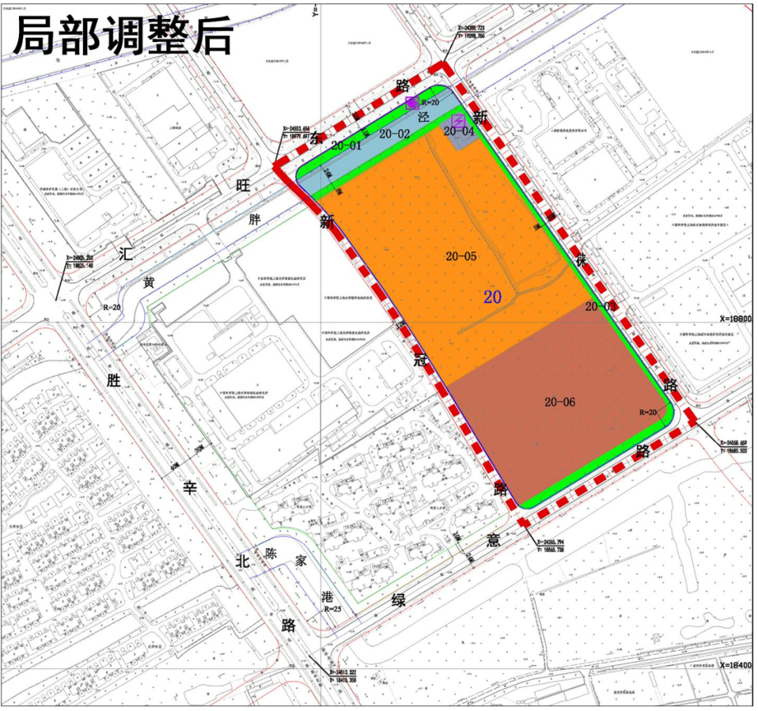 此次涉及调整的20街坊四至边界:东至新徕路、南至绿意路、西至新冠路、北至汇旺东路,用地面积约11.04公顷。