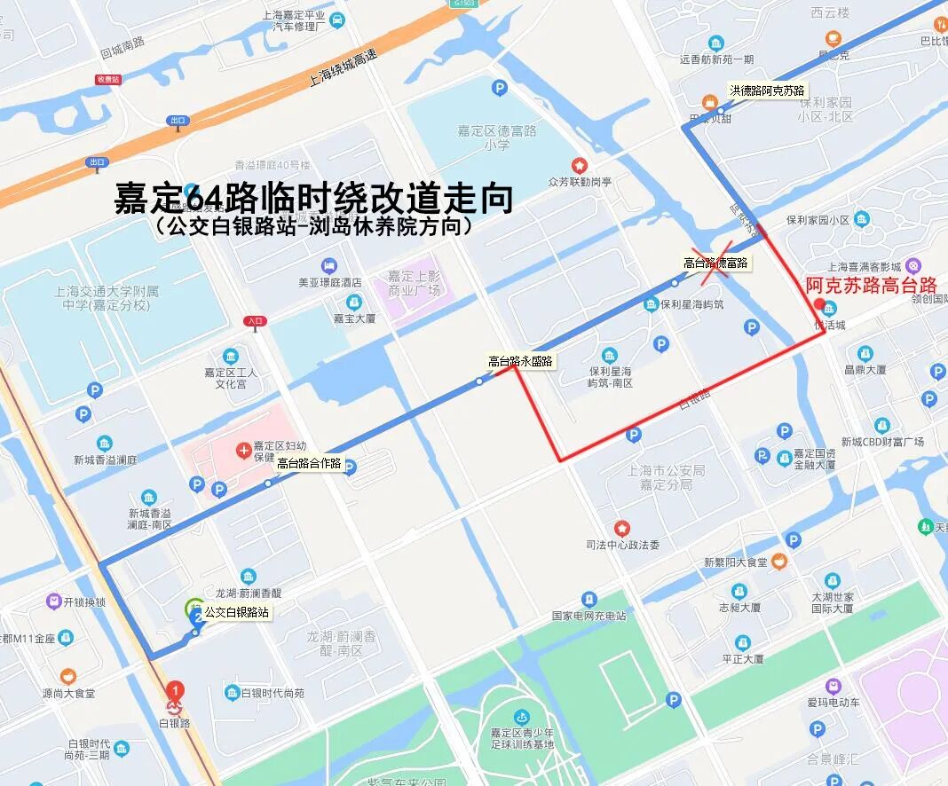 嘉定64路(上行)临时绕改道走向: 自公交白银路站起,循原线至高台路、永盛路、白银路、阿克苏路循原线至浏岛休养院止。嘉定64路(下行)走向不变。