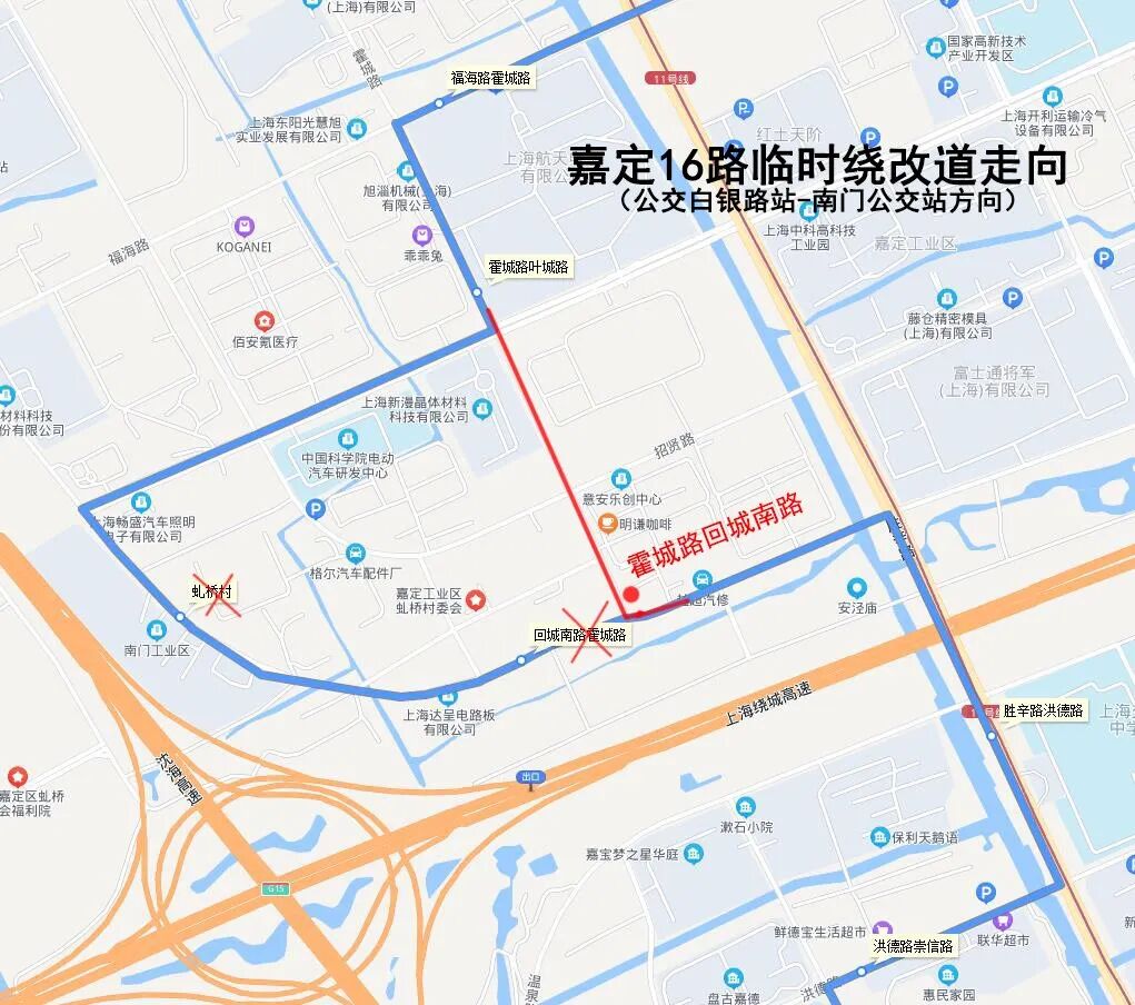 嘉定16路(下行)临时绕改道走向:自公交白银路站起,循原线至胜辛路、回城南路、霍城路、福海路循原线至南门公交站止。嘉定16路(上行)走向不变。