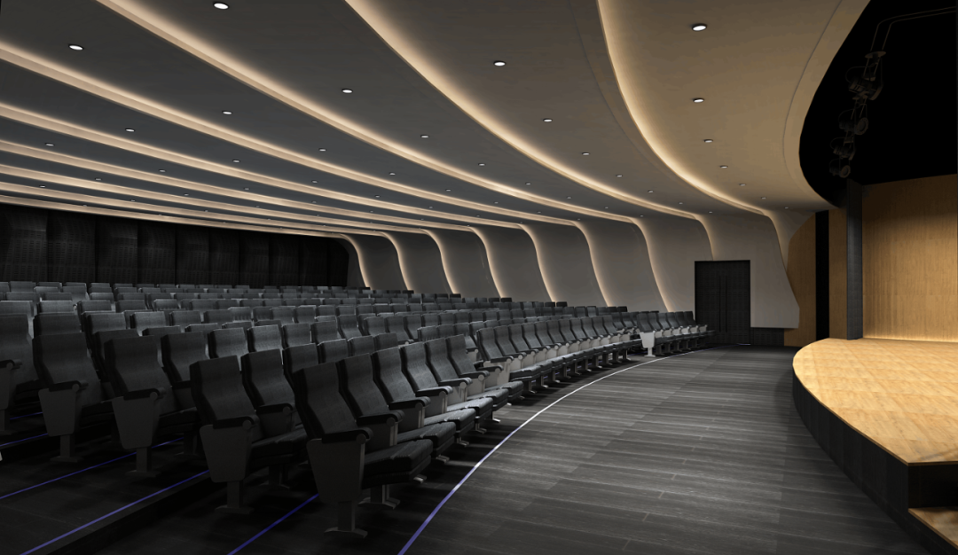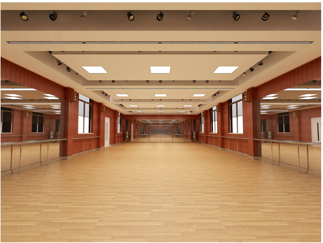 新建建筑一层主要为设备用房及机动车、自行车停车库;二层为文化展示厅,拥有323个座位的学生剧场小剧场;三层为专用教室;四层为体育馆(可设置1个标准篮球场或6片羽毛球场)。
