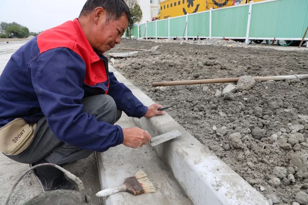 道路两旁的绿化带和人行道也在建造中
