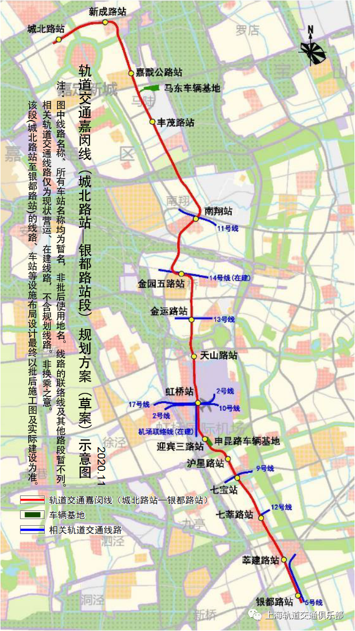 嘉闵线(一期,暂名)线路起自嘉定区城北路站(暂名),终至闵行区银都路站(暂名),线路正线全长44.0km(不含联络线),全线设站15座,设马东动车运用所1座、申昆路停车场1座。目前工程筹划工期6年。该工程勘察、工程设计正由中铁上海设计院集团有限公司、上海市隧道工程轨道交通设计研究院组成的联合体承担。