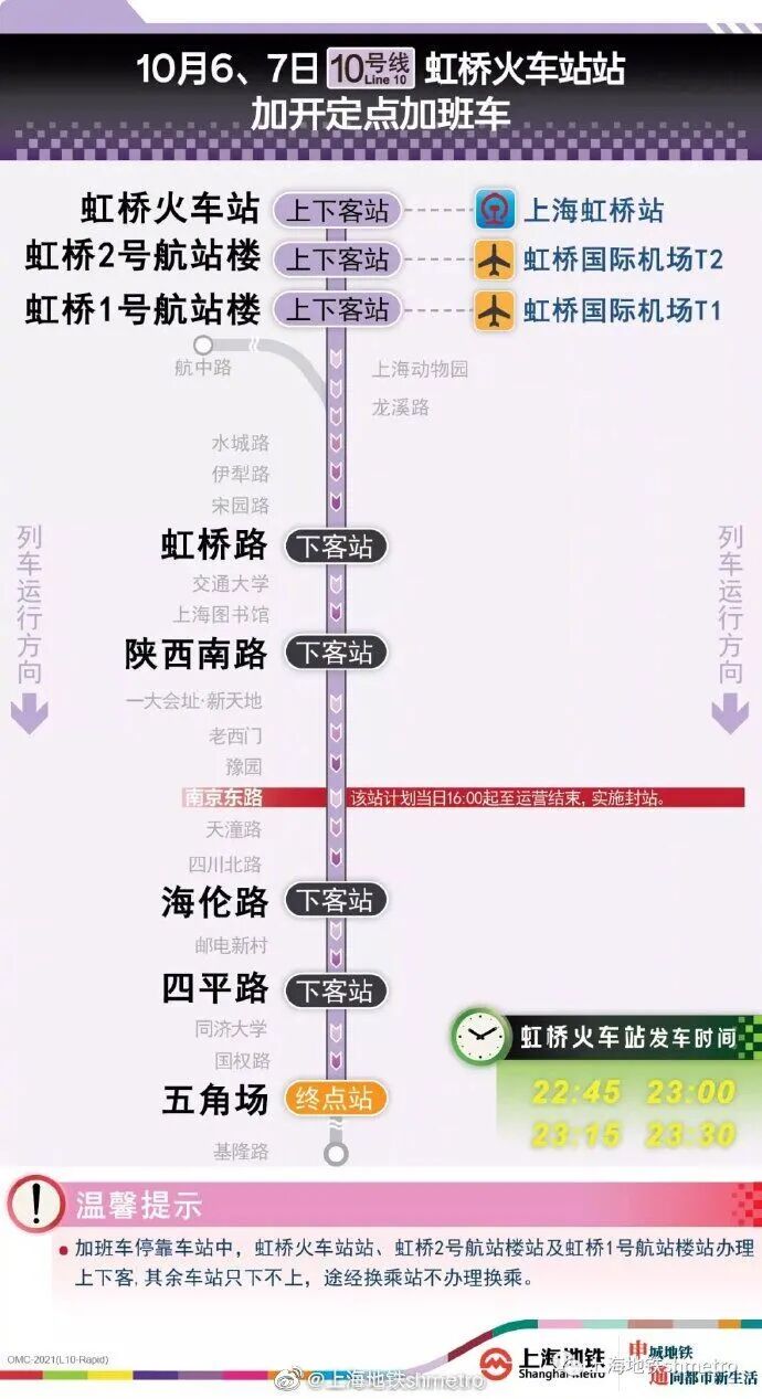 10号线虹桥火车站站往五角场站方向定点加班车,沿途仅停靠虹桥火车站站、虹桥2号航站楼站、虹桥1号航站楼站、虹桥路站、陕西南路站、海伦路站、四平路站、五角场站,其余车站跳停。停靠车站中,虹桥火车站站、虹桥2号航站楼站、虹桥1号航站楼站可上下客,其余车站只下不上,途经换乘站不可换乘。