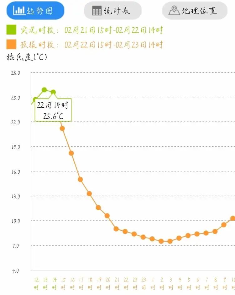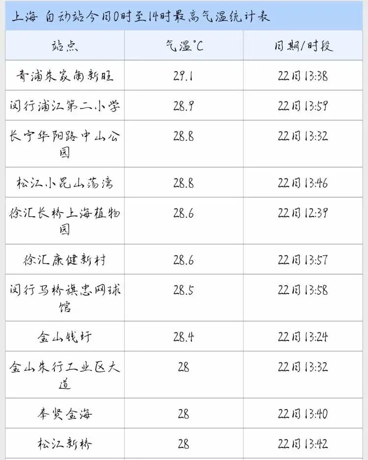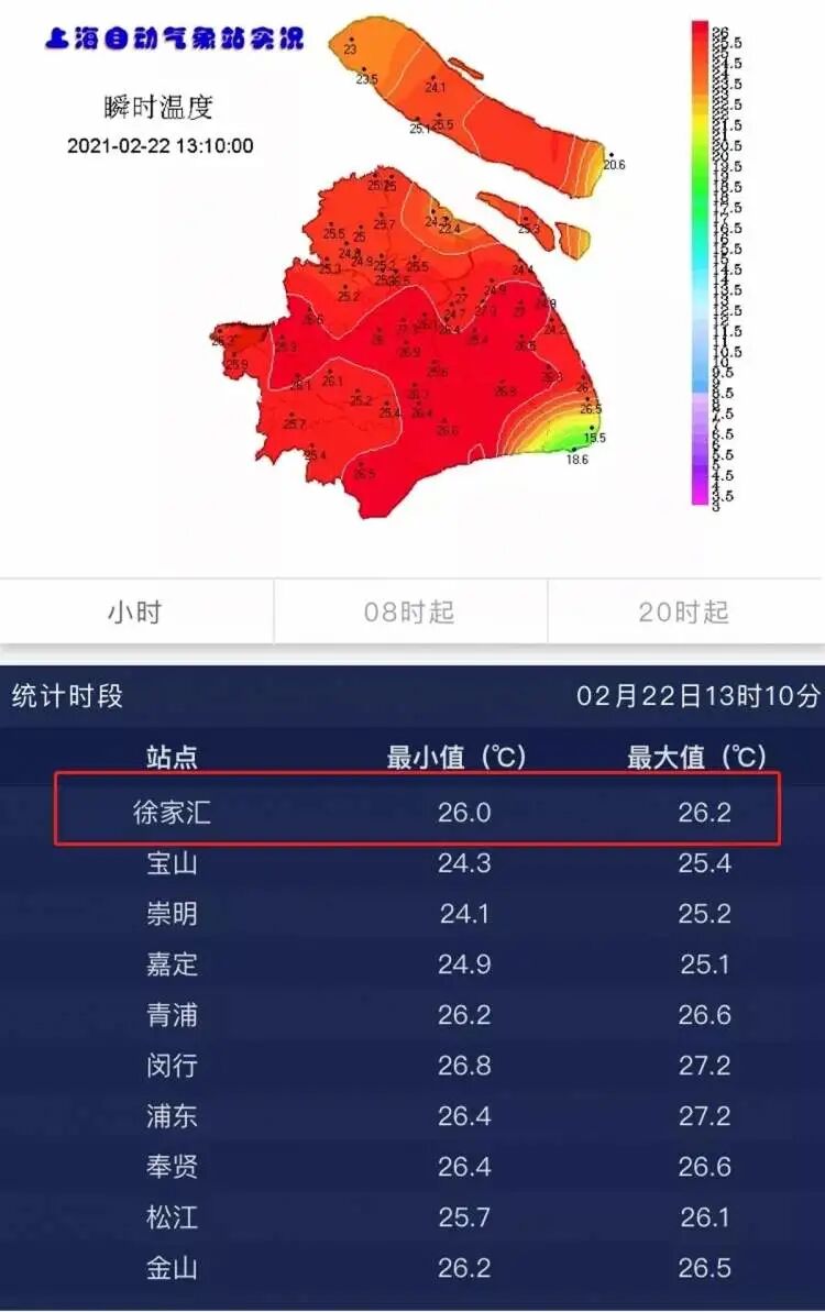 今天徐家汇的最高气温达到26.2℃,是2月下旬的同期历史第二高,仅次于1921年2月27日的28.5℃。     从自动气象站来看,青浦有地方超过了29℃,超过28℃的也不少,离30℃看上去仅“一步之遥”。