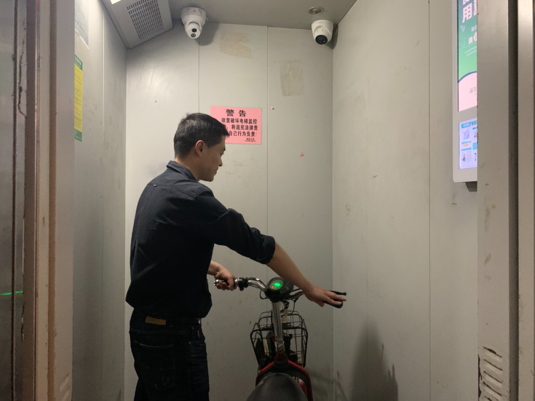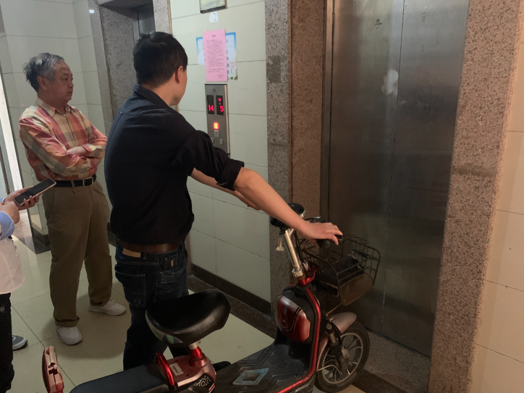 一男子推着电动车进入电梯后