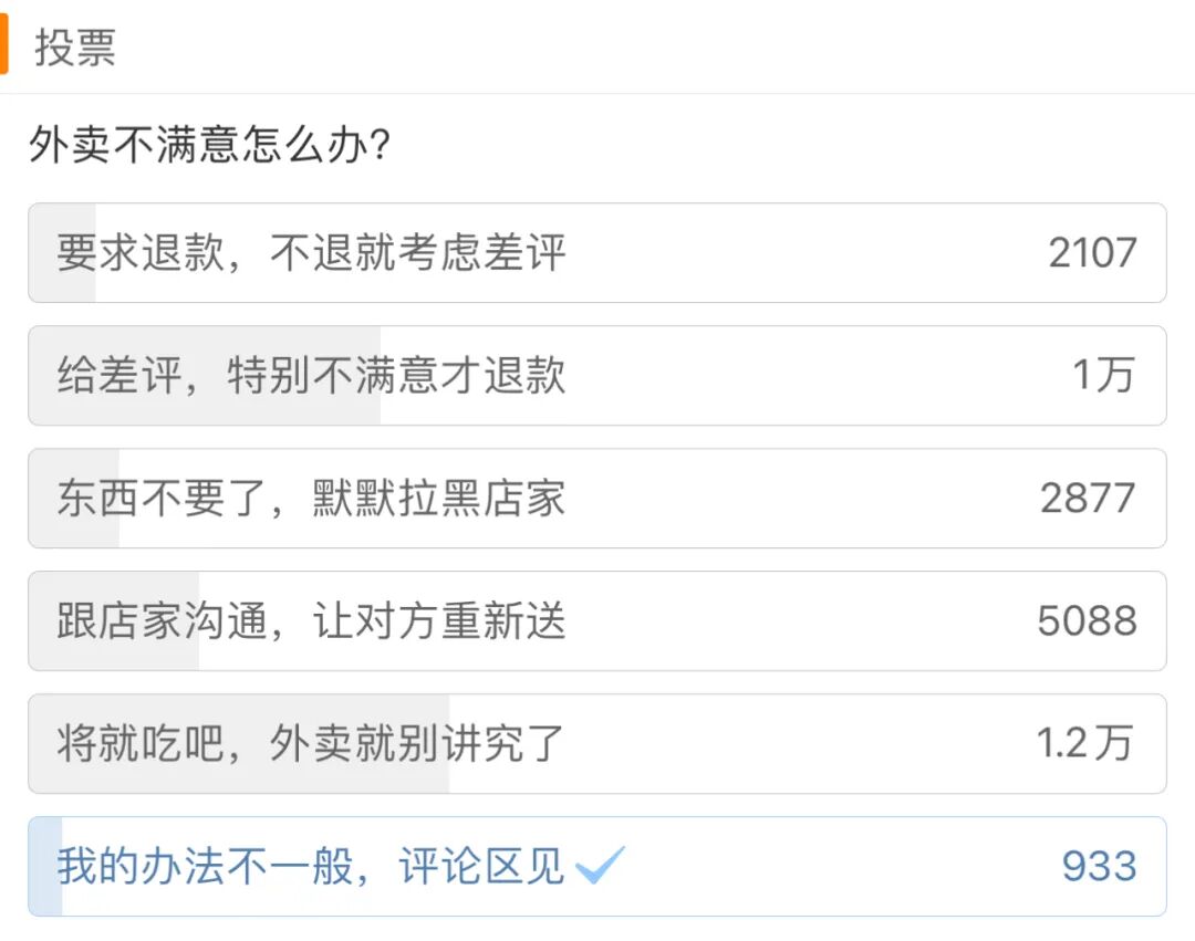 应该说,绝大多数点外卖的客户,对商家是比较宽容的。在1818黄金眼发起的一项有三万多人参与的网络投票中,近四成网友选择“将就吃吧,外卖就别讲究了”,三分之一选择了“特别不满意才退款”。