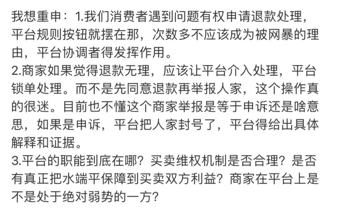 不过,由于新闻播出后,小林在长相、体型上遭遇了网友的攻击,也有网友站出来为小林说话,认为“退款次数多不应该成为被网暴的理由,平台应该真正把水端平,保证买卖双方的利益”。